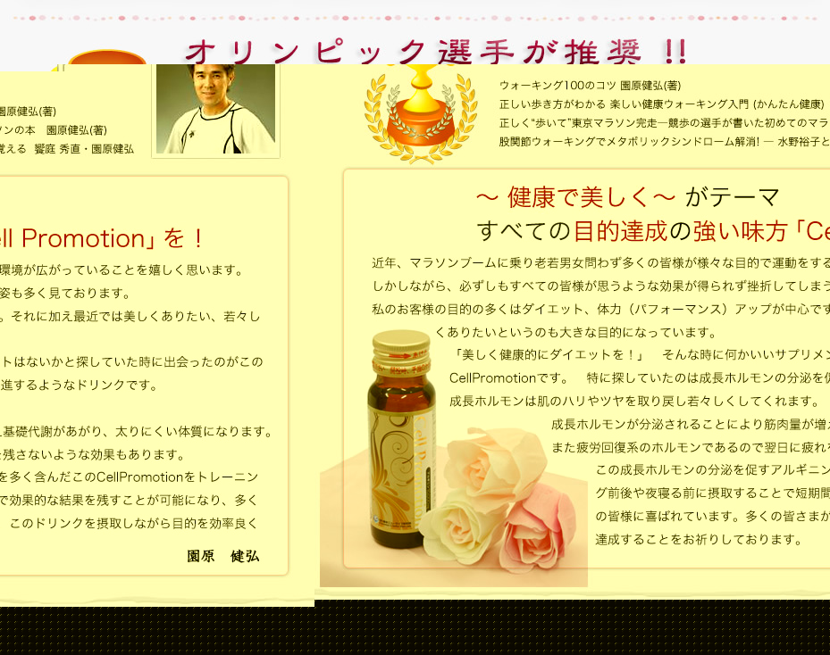 飲むだけの簡単美容法「セルプロモーション」 理想のボディライン 本気でアンチエイジングを考えている方へ セルプロモーションは成長ホルモンの分泌を促進することで 肌細胞の再生力を高め美肌をサポートし、新陳代謝を活発にすることで ダイエットをサポートします!! アルギニン、マカ、高麗人参、スッポン、シトルリン、ビタミン配合!! まさに飲む基礎化粧品です。